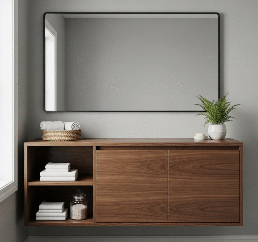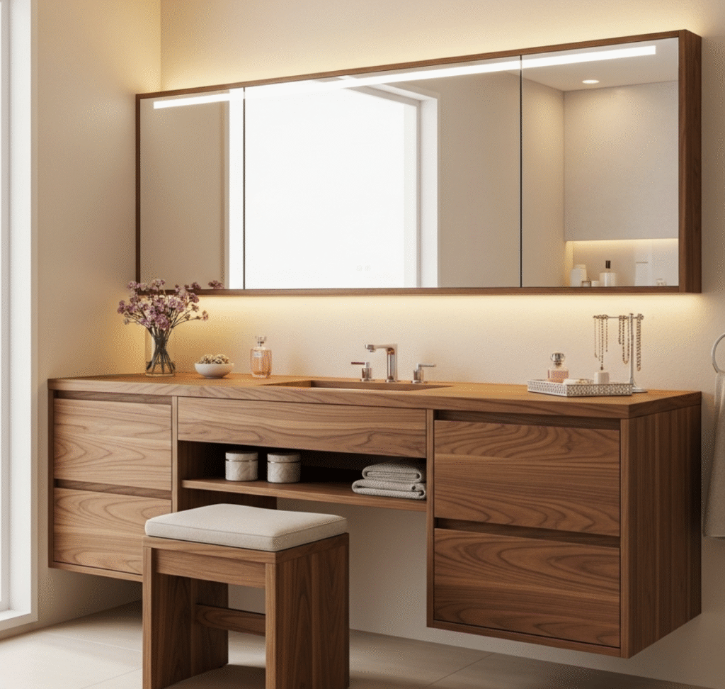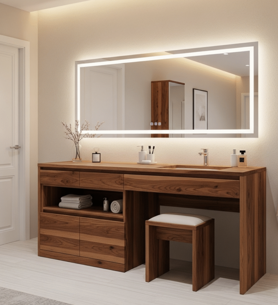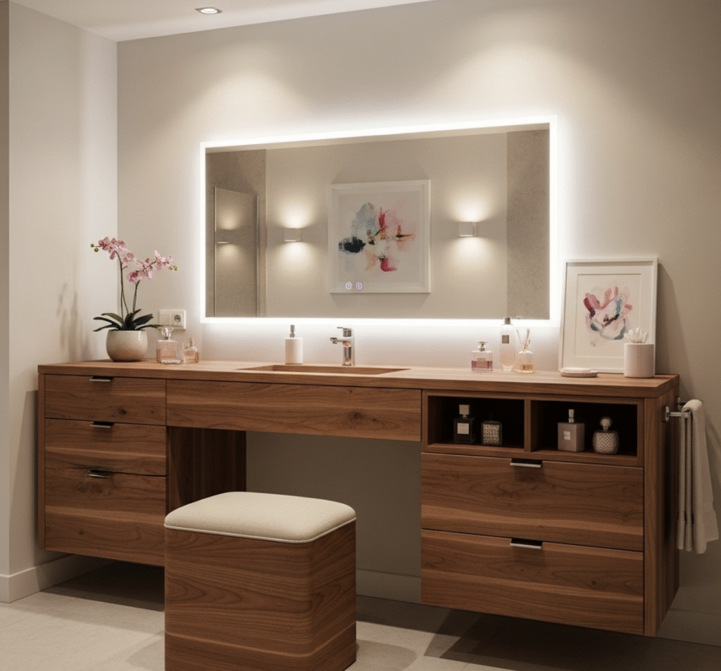 Nuestro vanity para baño combina espejo, superficie de apoyo y almacenamiento en un diseño funcional y elegante. Diseñado para quienes valoran un rincón de cuidado personal, lo adaptamos con compartimentos organizadores, iluminación opcional y acabados que elevan el estilo del ambiente.