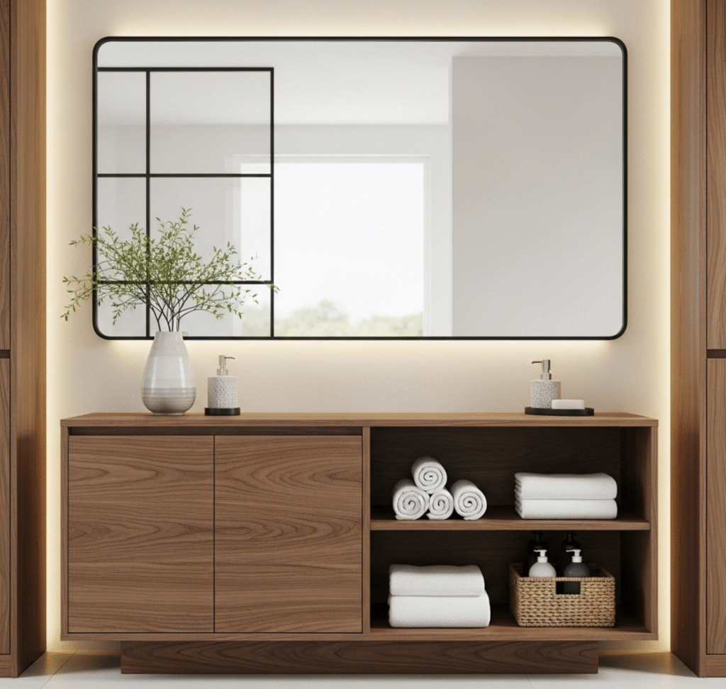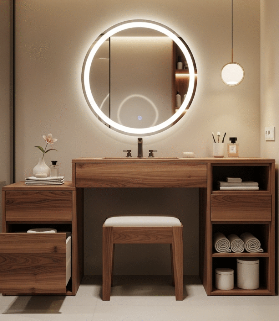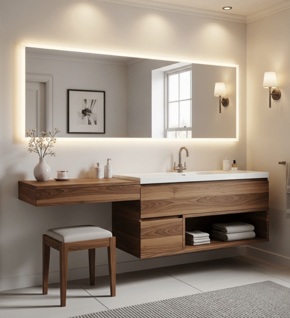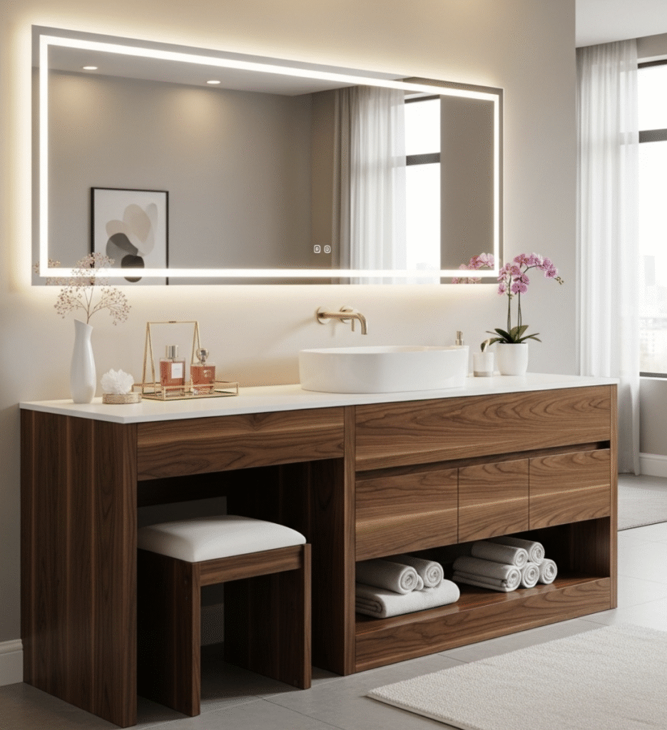 Nuestro vanity para baño combina espejo, superficie de apoyo y almacenamiento en un diseño funcional y elegante. Diseñado para quienes valoran un rincón de cuidado personal, lo adaptamos con compartimentos organizadores, iluminación opcional y acabados que elevan el estilo del ambiente.