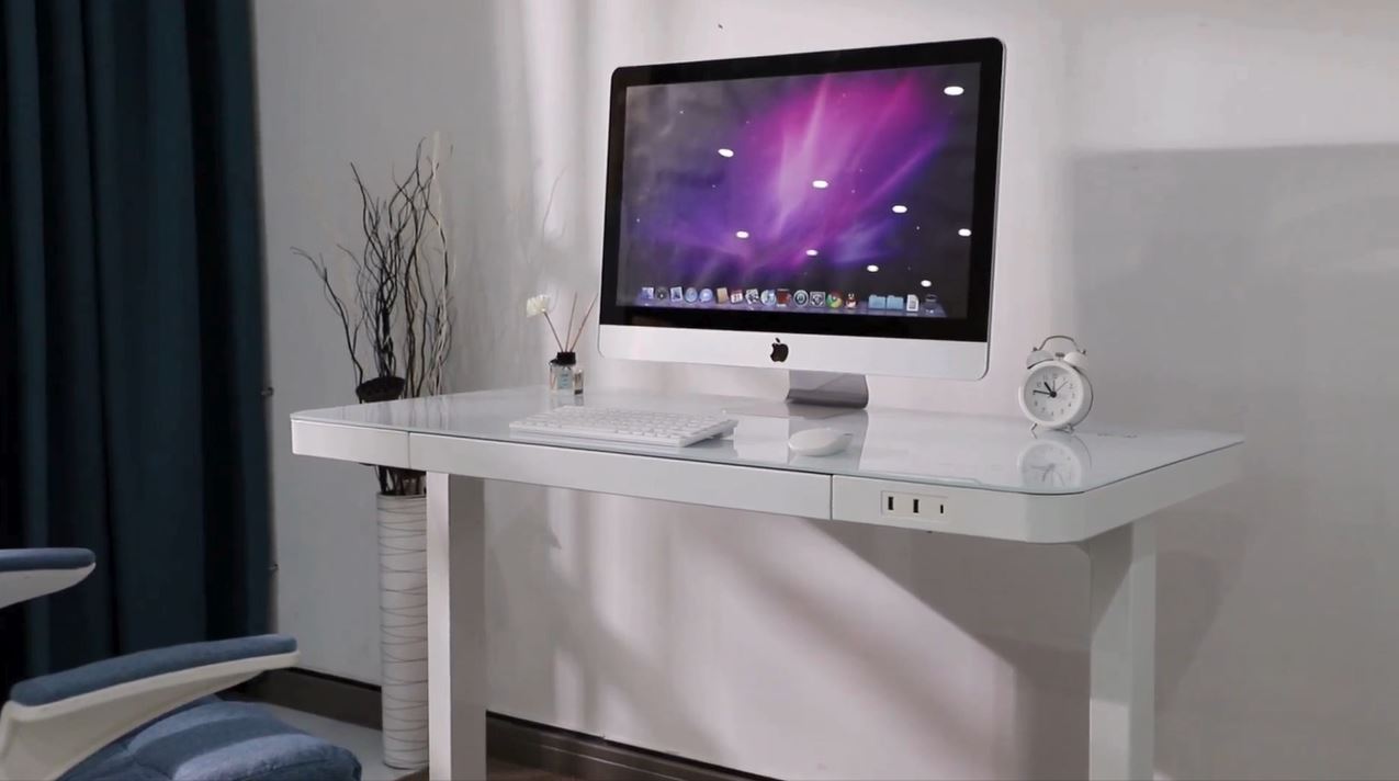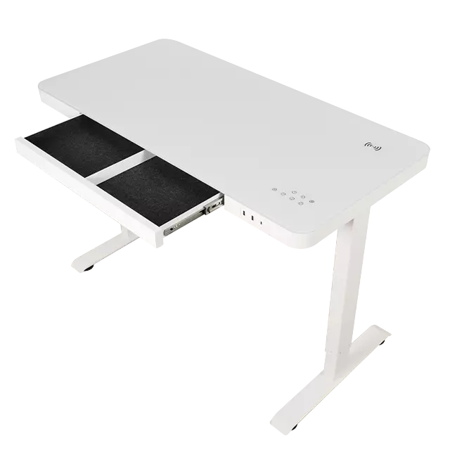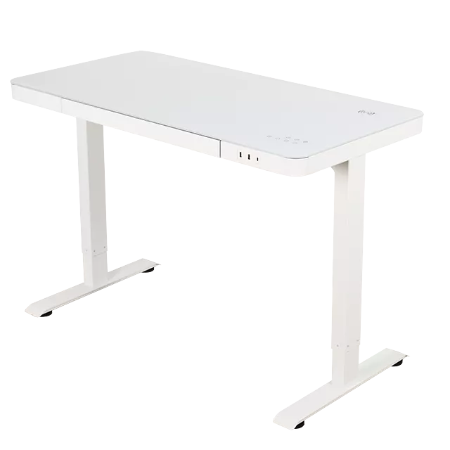Escritorio inteligente de altura ajustable eléctrico. Altura de 71-121 cm. Con sistema anti colisión. Cubierta de cristal 120 x 60cm con cargador inalámbrico, USB de 2.4 amperios, simultáneamente alimentan los dispositivos a máxima velocidad. Memoria para 3 posiciones. Incluye cajonera. Estructura acabado en pintura electrostática horneada. *No incluye elementos de ambientación*