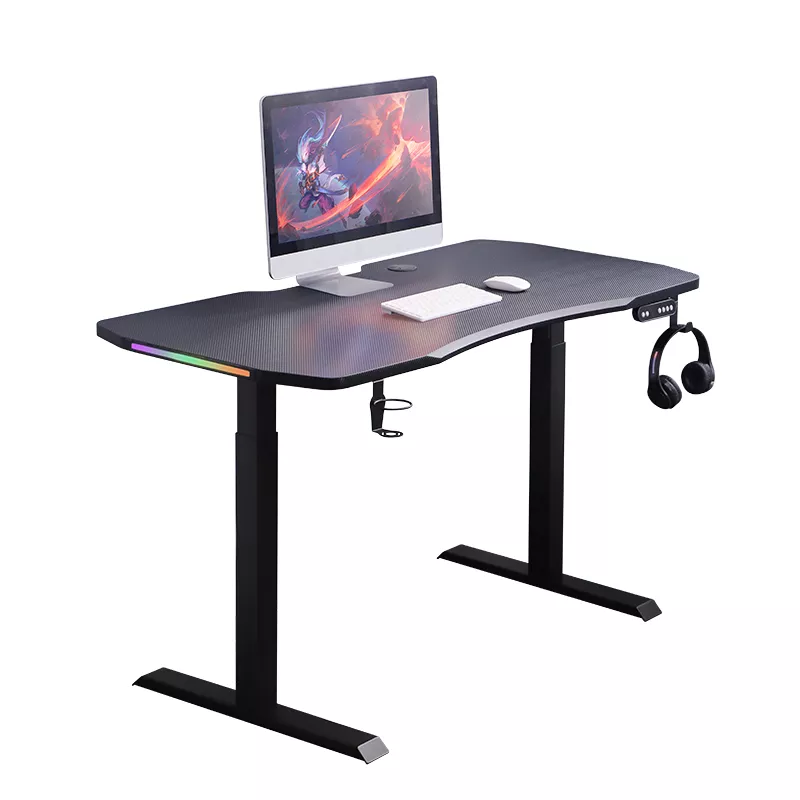 Escritorio gamer de altura ajustable eléctrico. Altura de 71.5-112 cm. Con sistema anti colisión. Cubierta de fibra de carbono con textura, de 120 x 60 cm. Memoria para 3 posiciones. *No incluye elementos de ambientación*